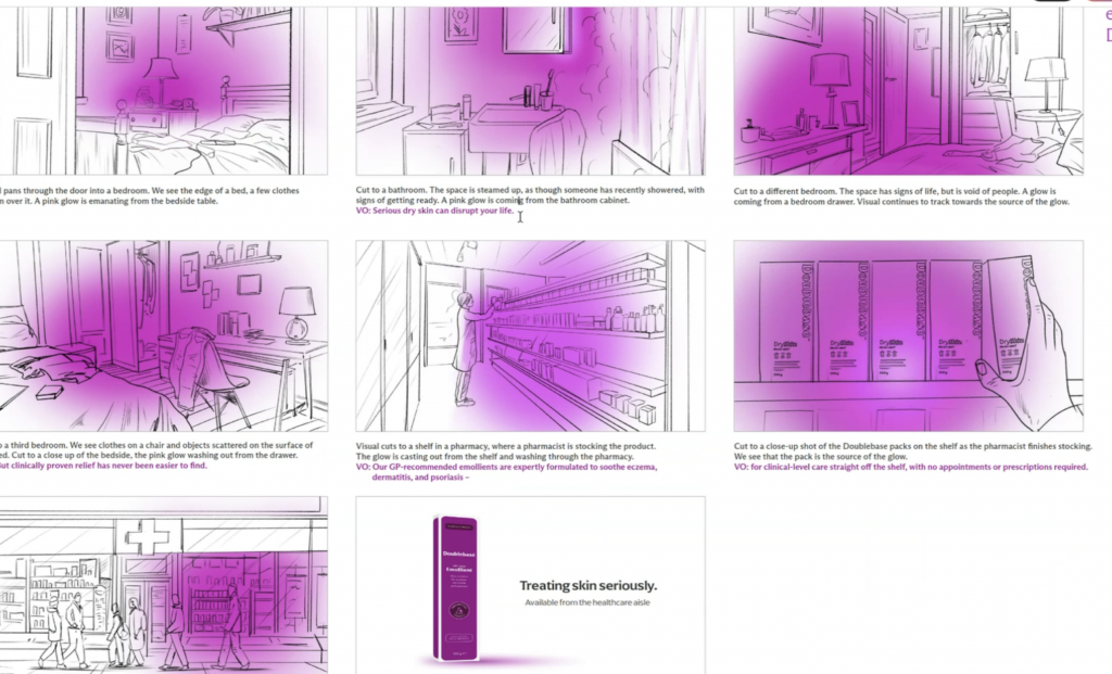 I’m currently working on a fully integrated campaign for Doublebase, a medically-formulated eczema emollient. It will hit TV, OOH, social and press, and adapt to target HCPs as well as everyday serious dry skin sufferers. Ask me about this project for more details on the concept development and copy!